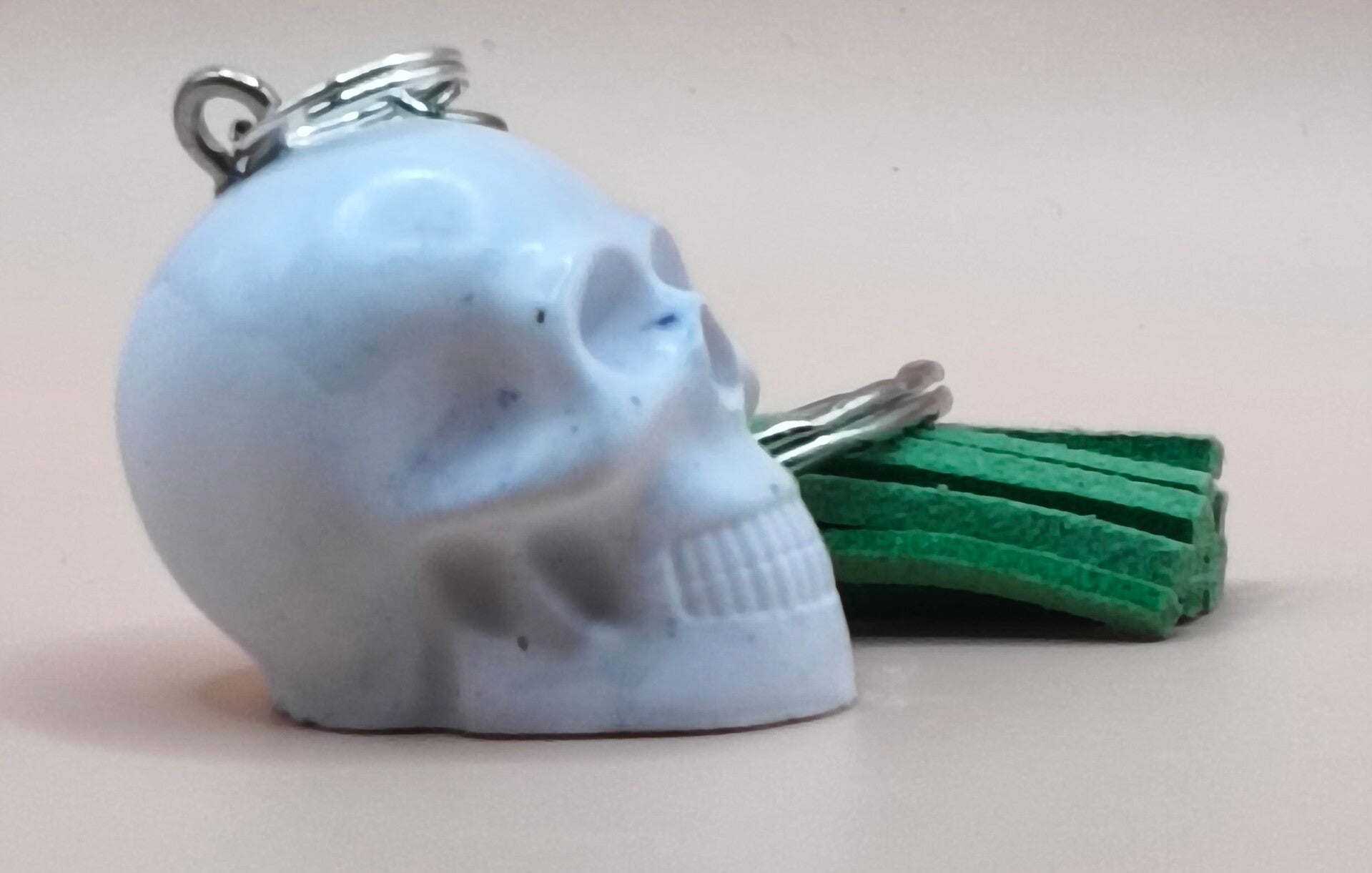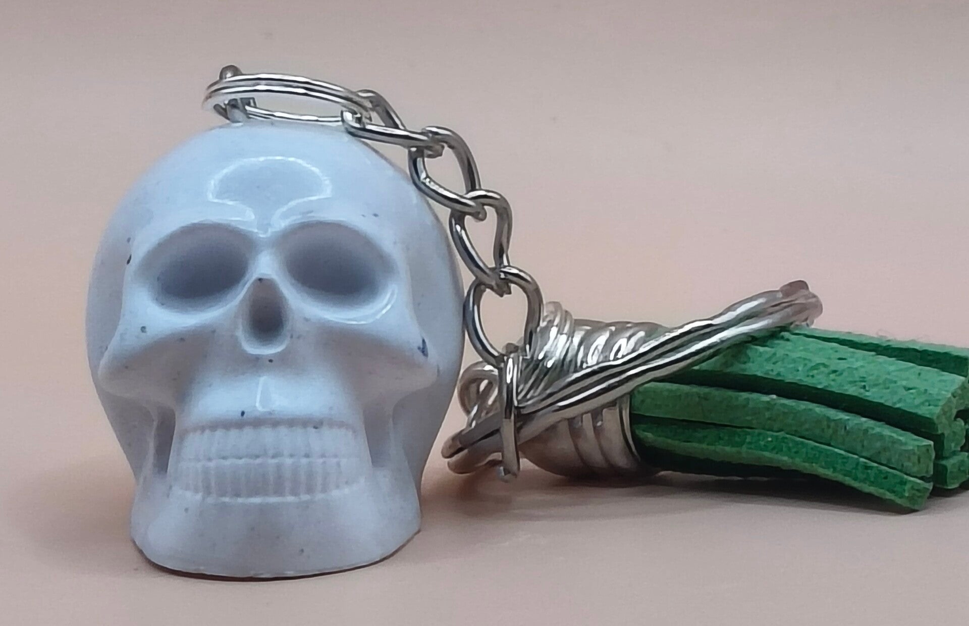 Eco Resin, white mini skull keyring with green tassel. Sealed with clear gloss finish.