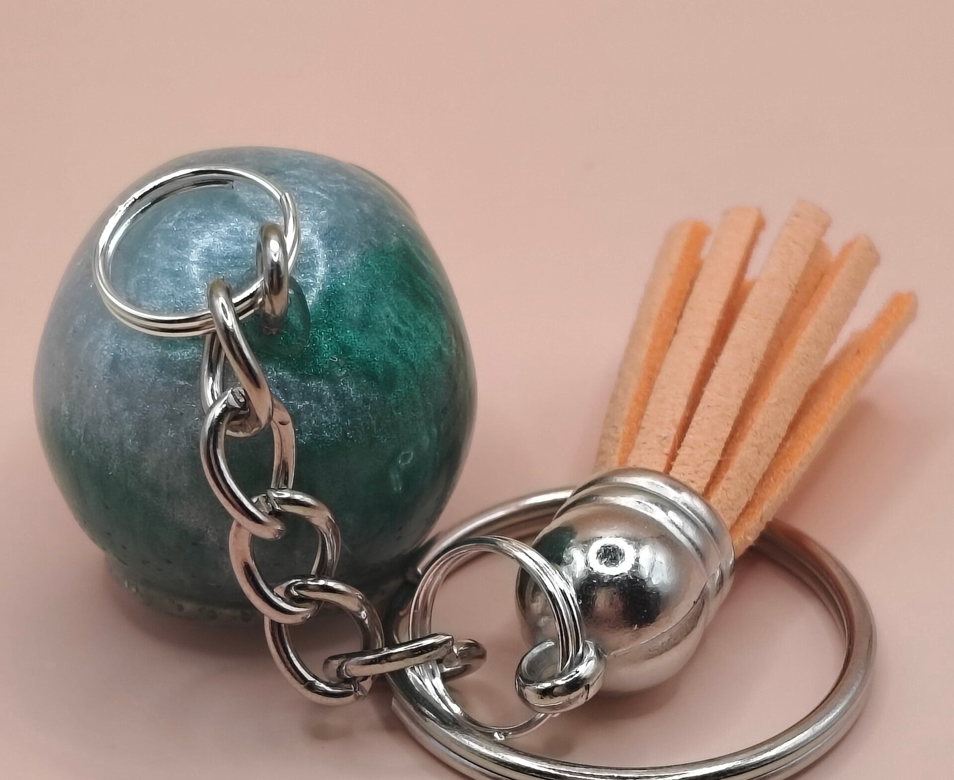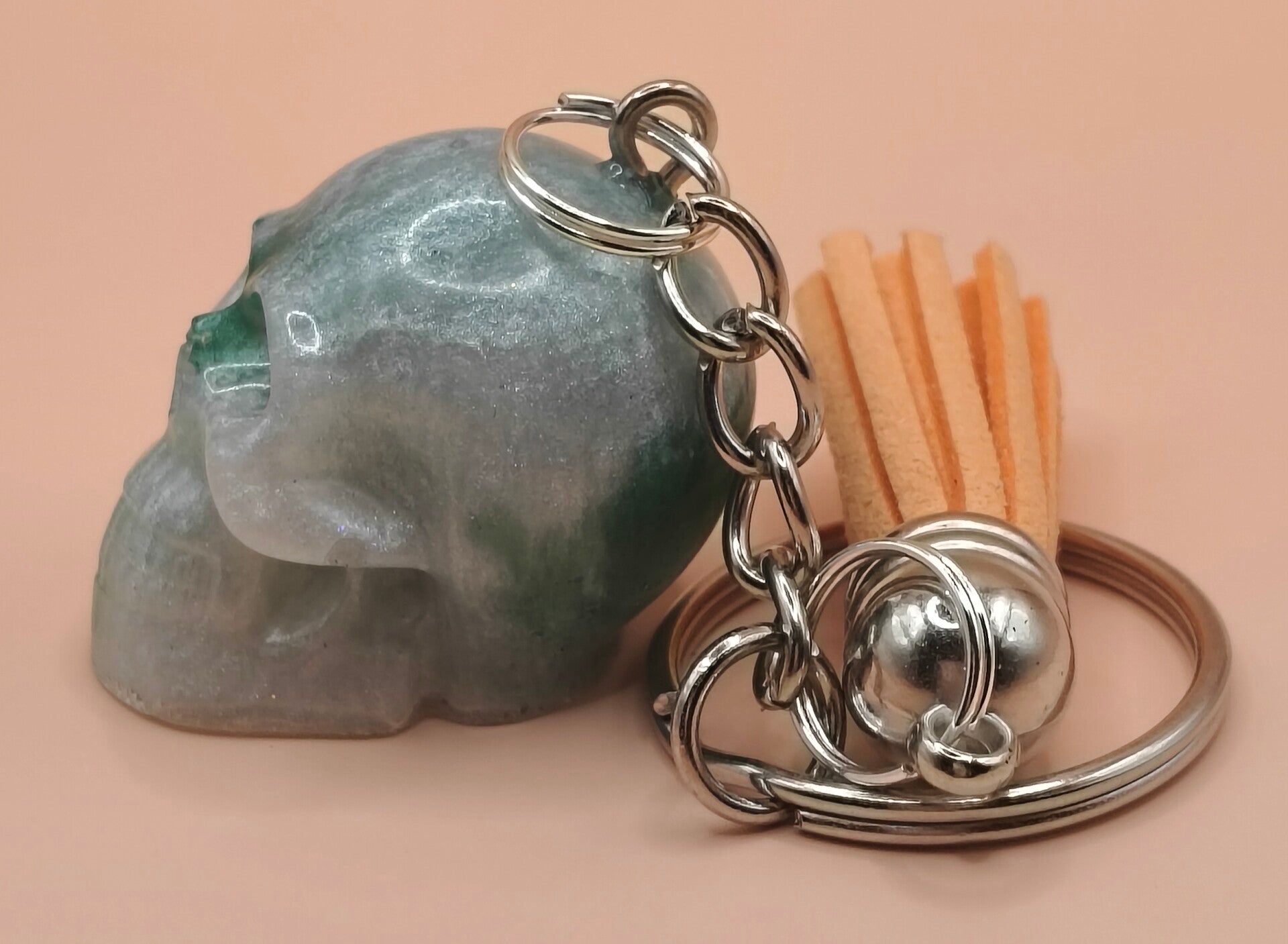 Epoxy resin, green and white skull keyring with orange tassel.