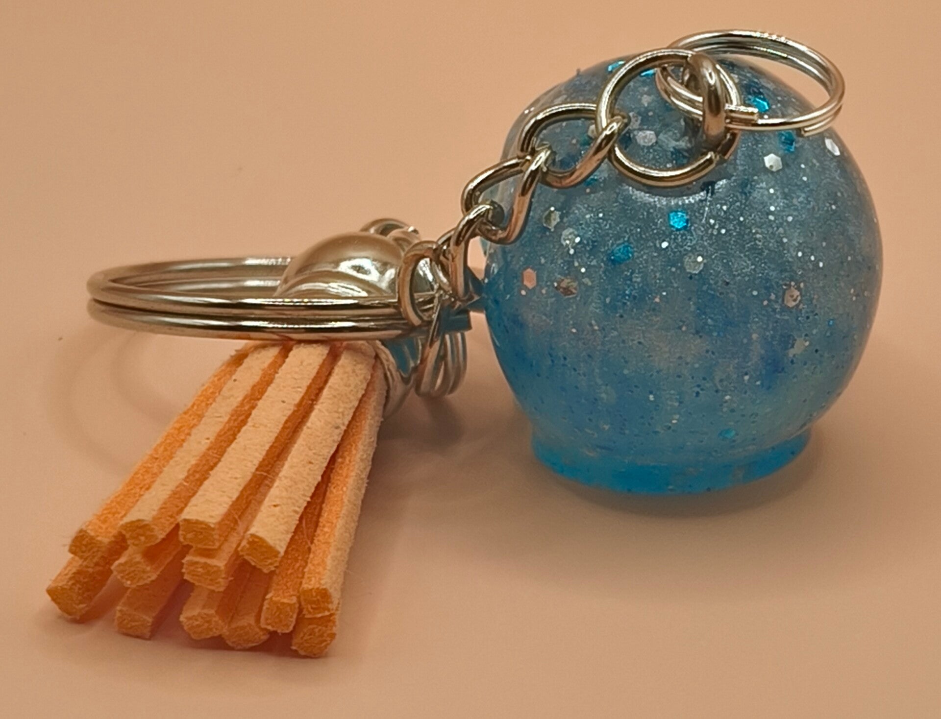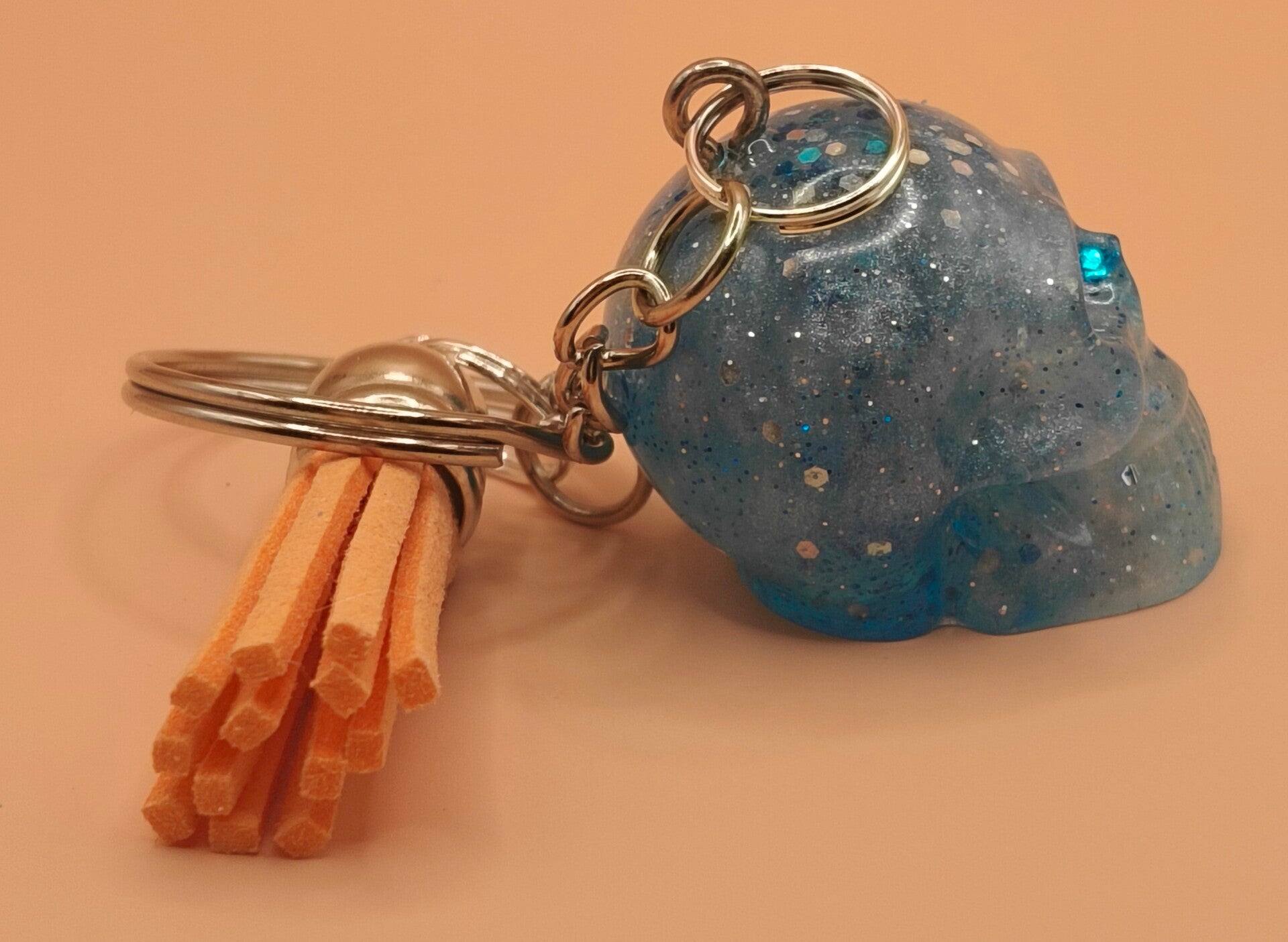 Epoxy resin, blue and white skull keyring with orang tassel.