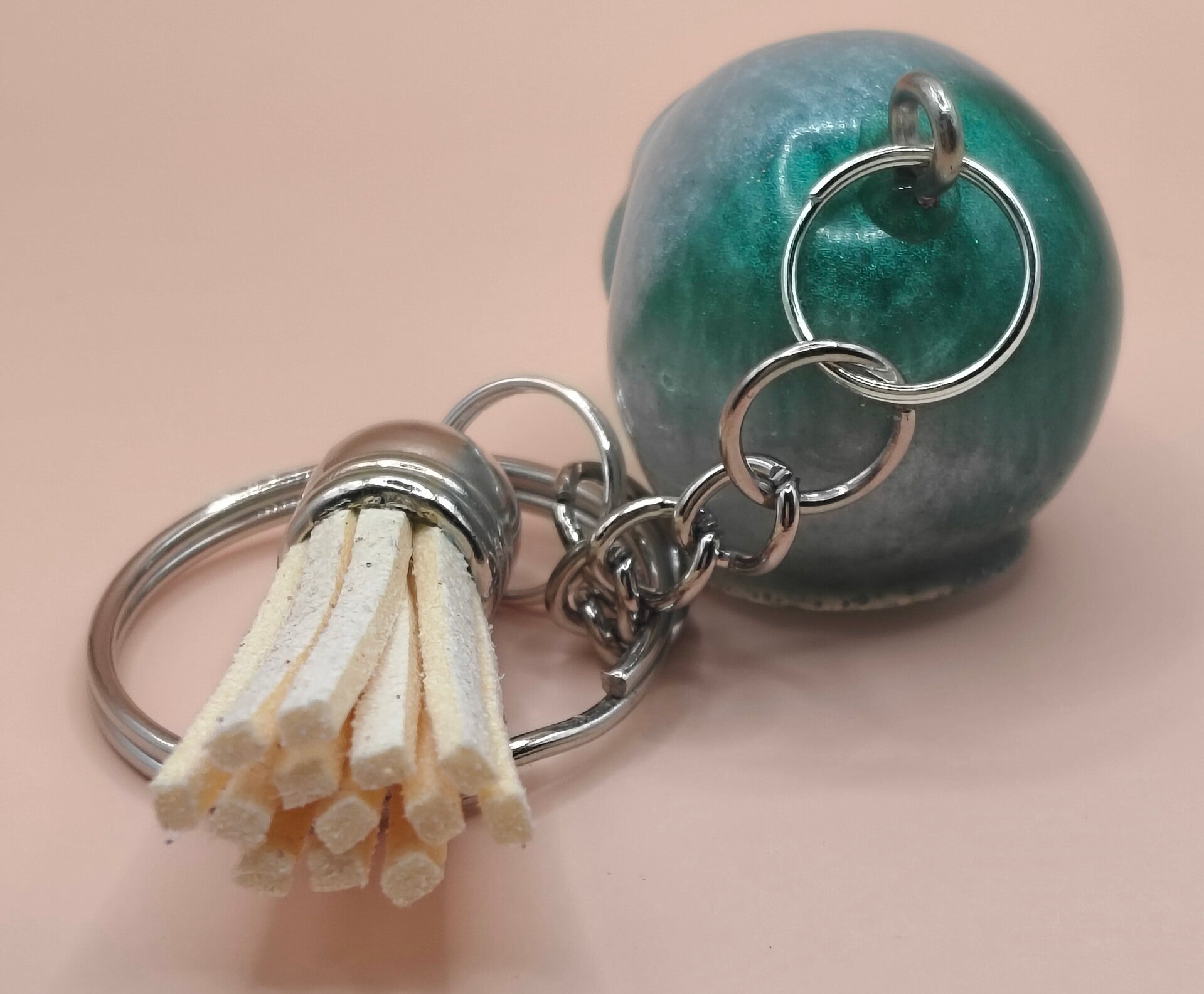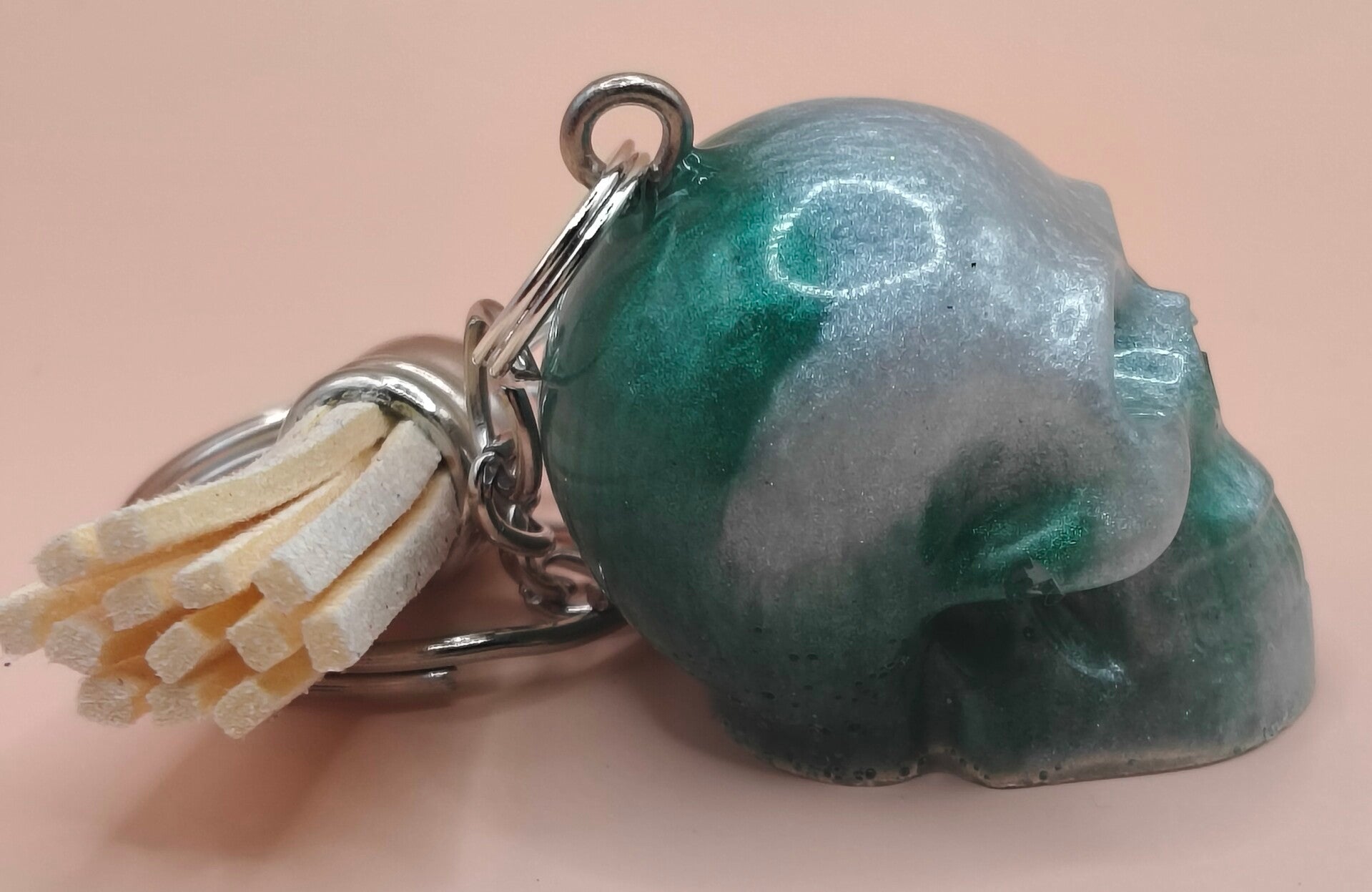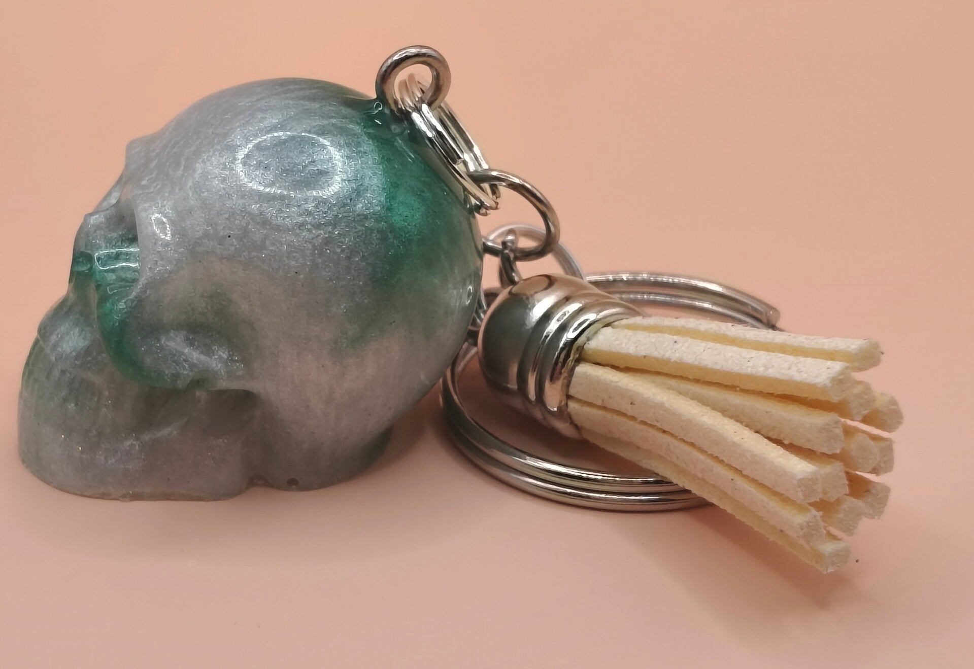 Epoxy resin, green and white skull keyring with cream tassel.