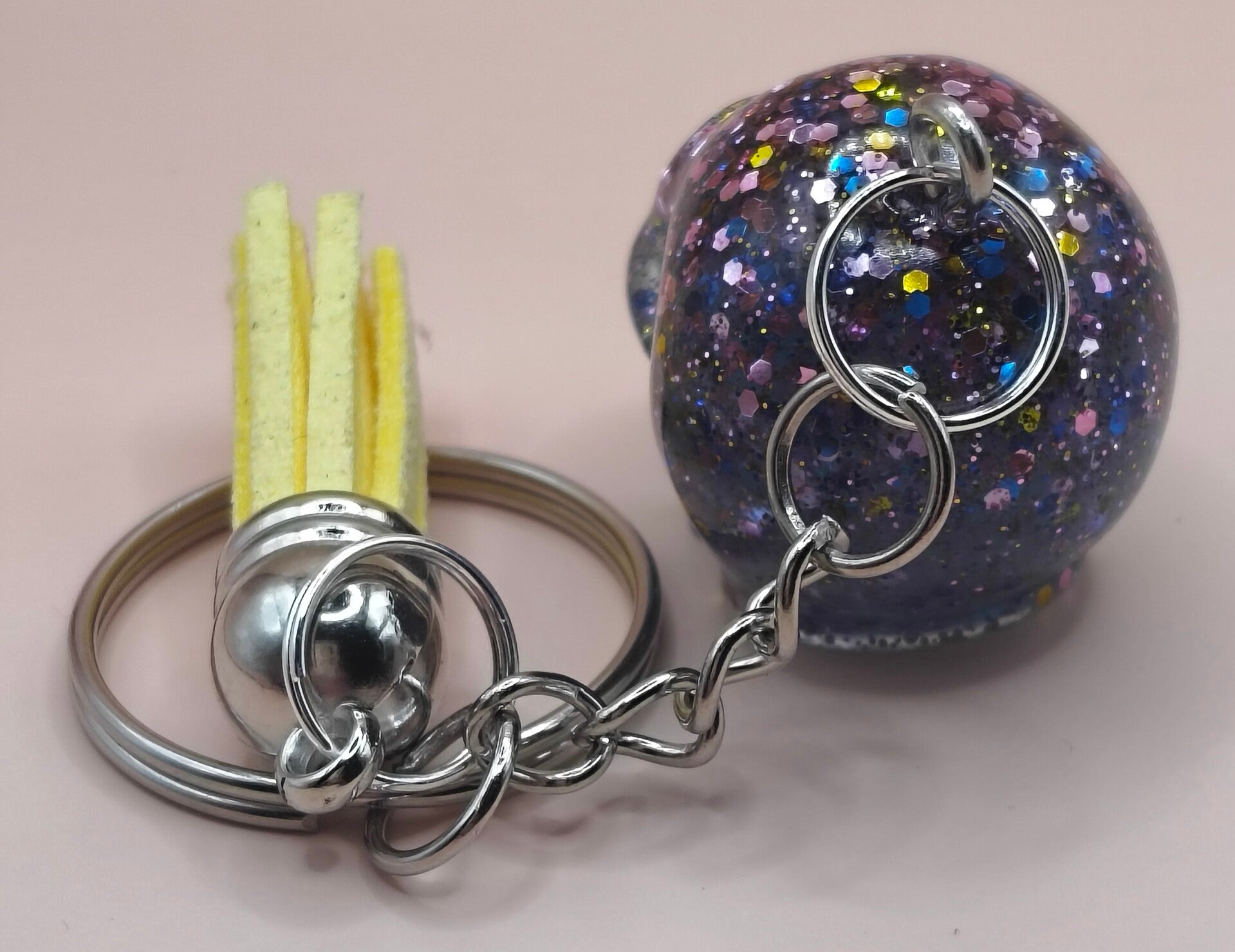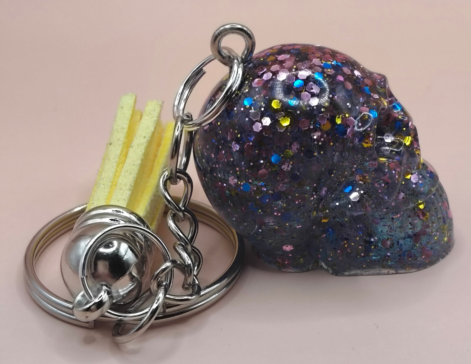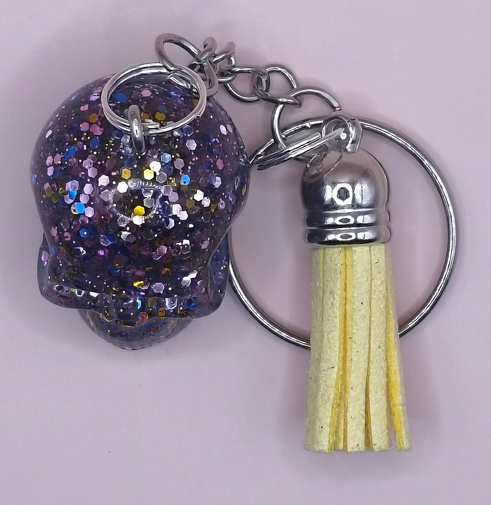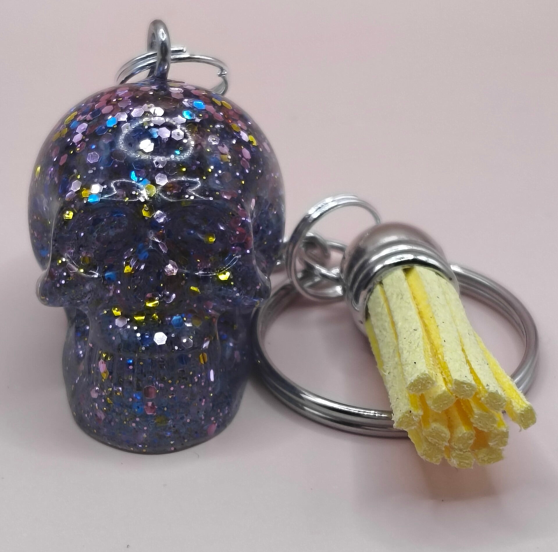 Epoxy resin, glitter skull keyring with yellow tassel.