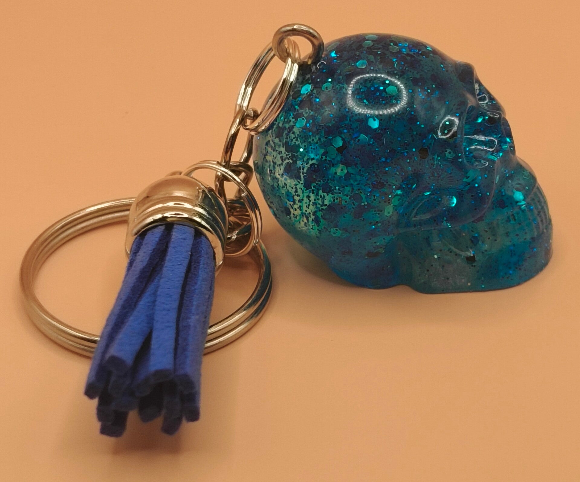 Epoxy resin, mostly blue glitter and white skull keyring with blue tassel.
