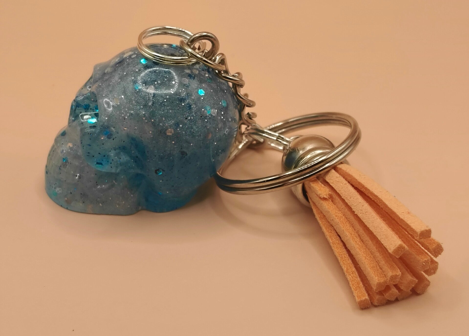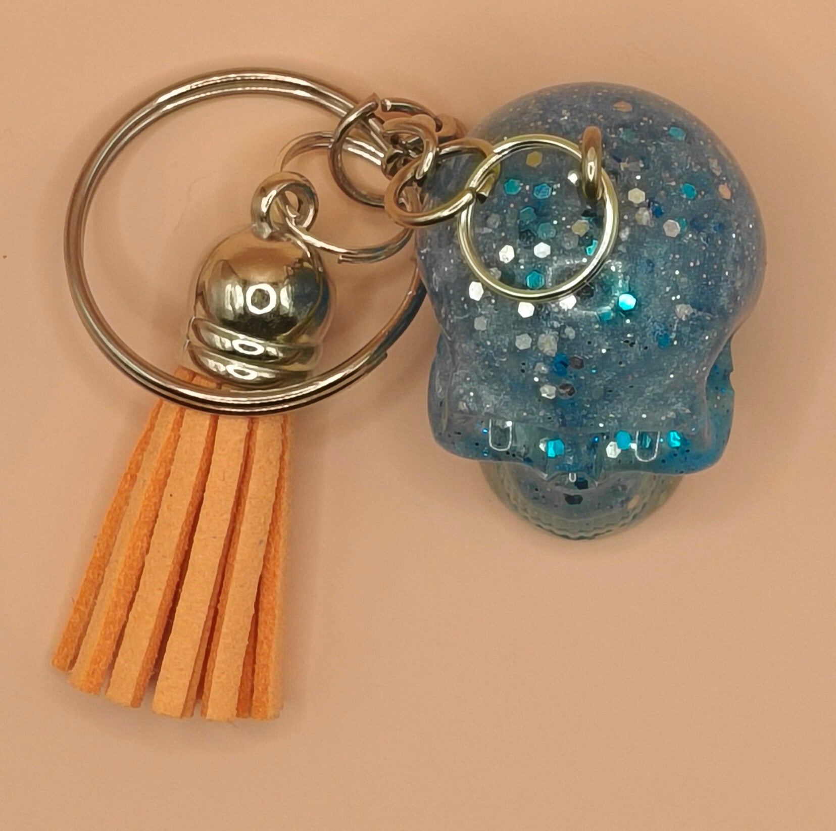 Epoxy resin, blue and white skull keyring with orange tassel.