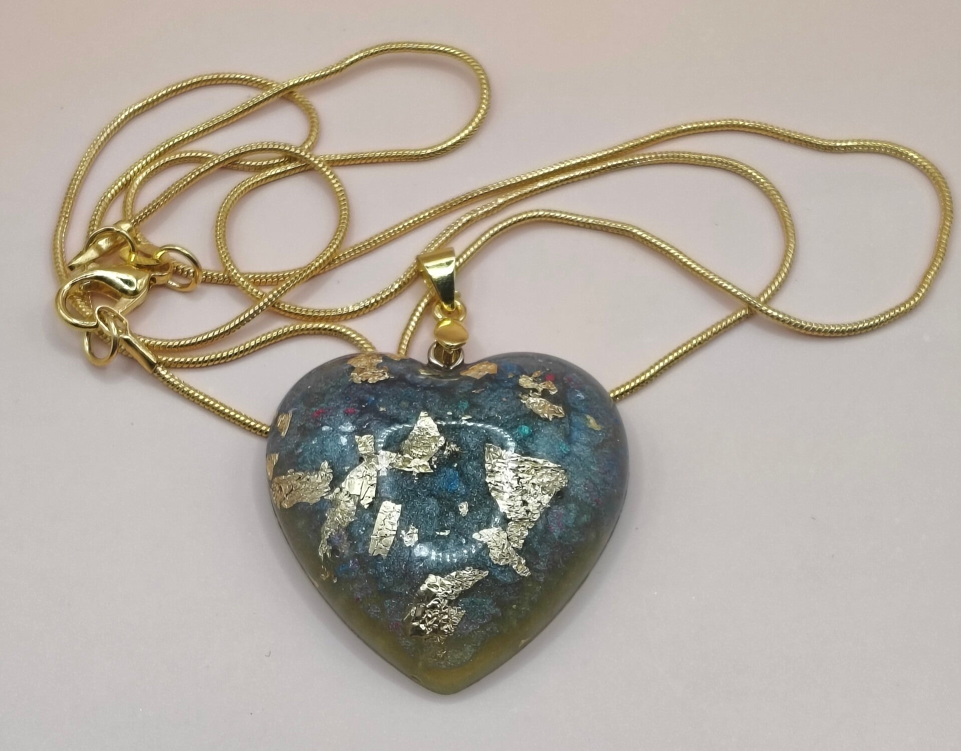 Epoxy resin, large heart with bits of gold leaf necklace with long gold plated chain 925.