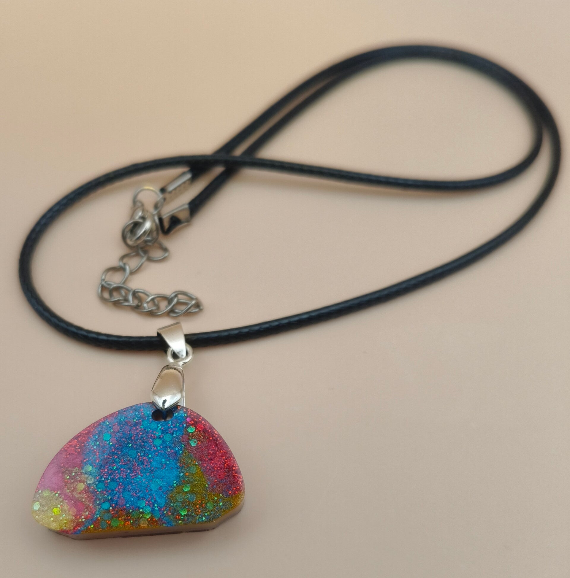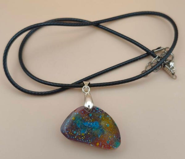 Epoxy resin, small odd shape rainbow necklace. With corded chain.