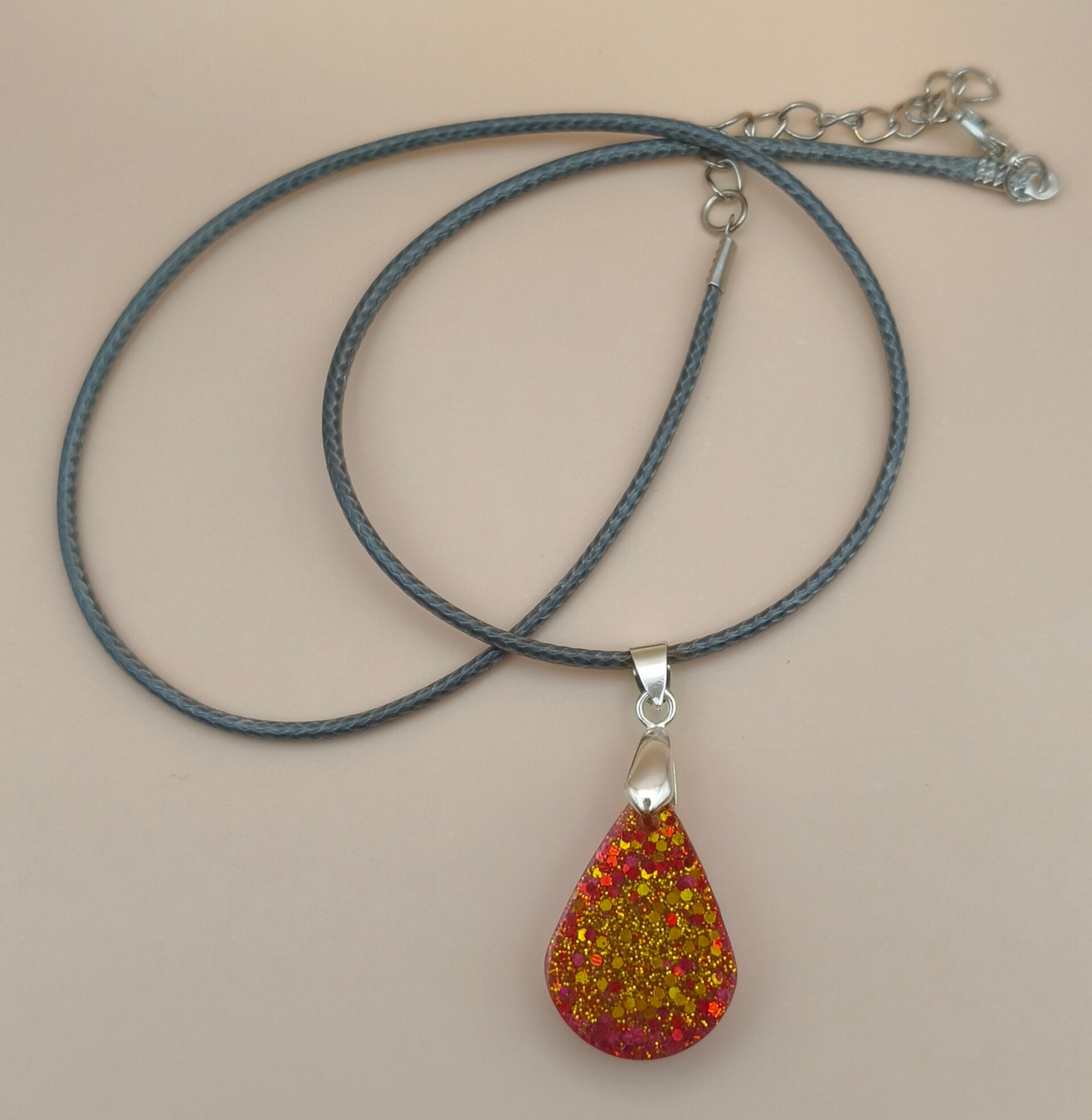 Epoxy resin, tear drop red and gold necklace on corded chain