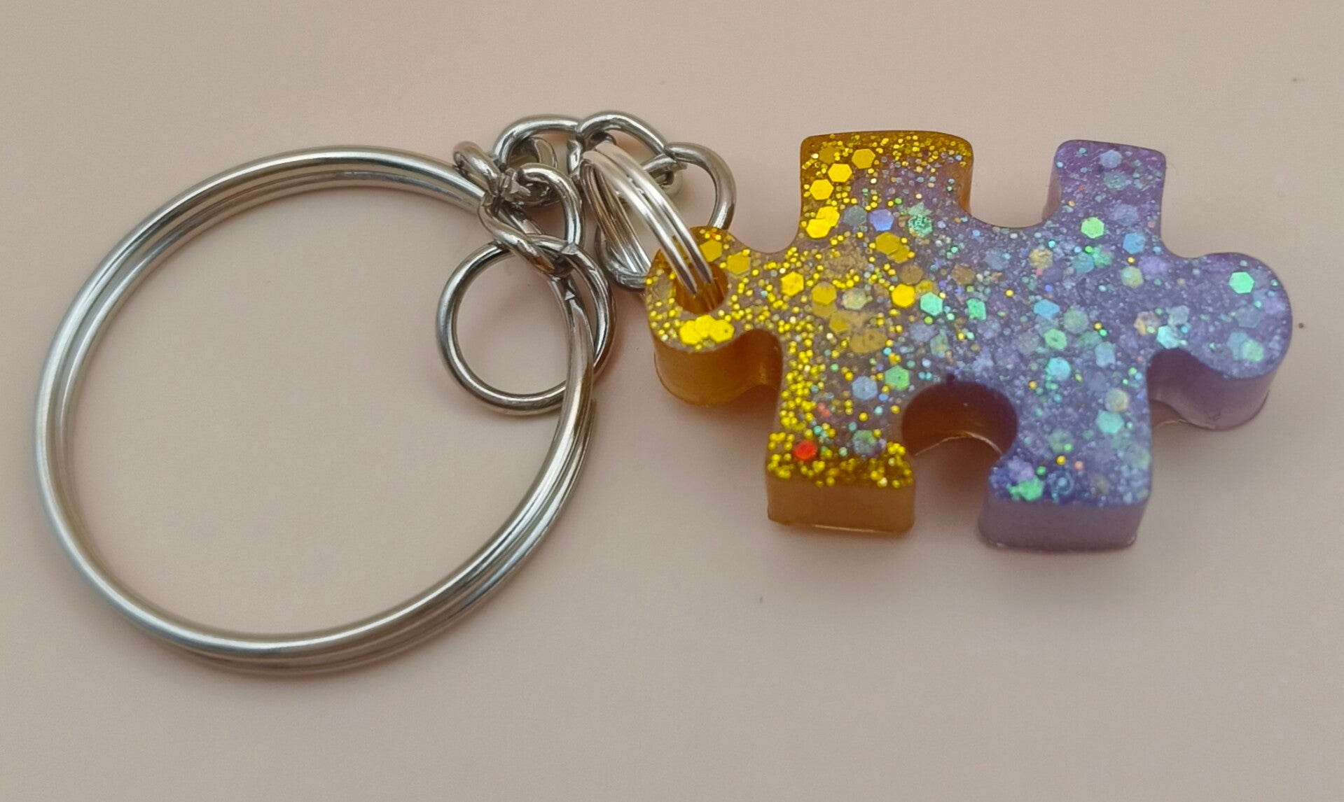 Epoxy resin, small puzzle piece gold and purple keyring