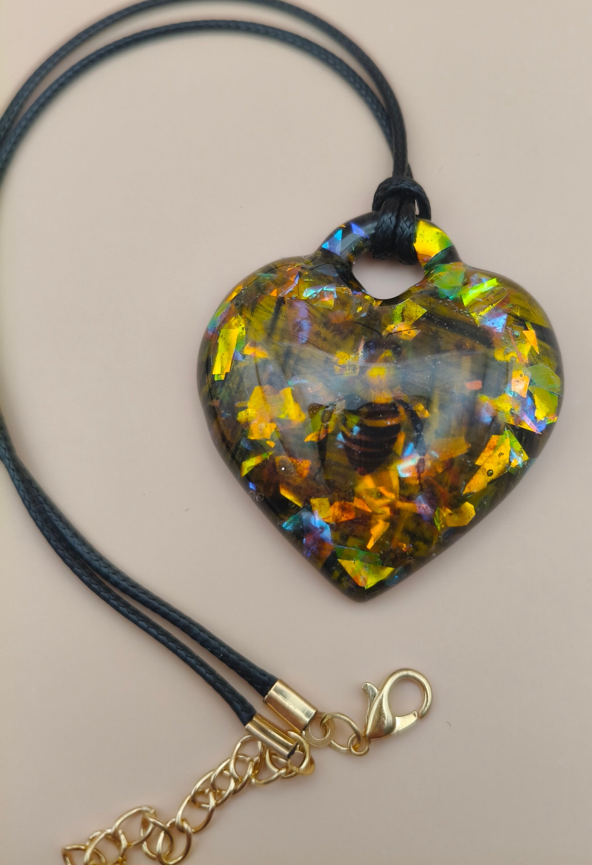 UV resin, heart necklace, fluorescent flecks with bee image. With black corded chain